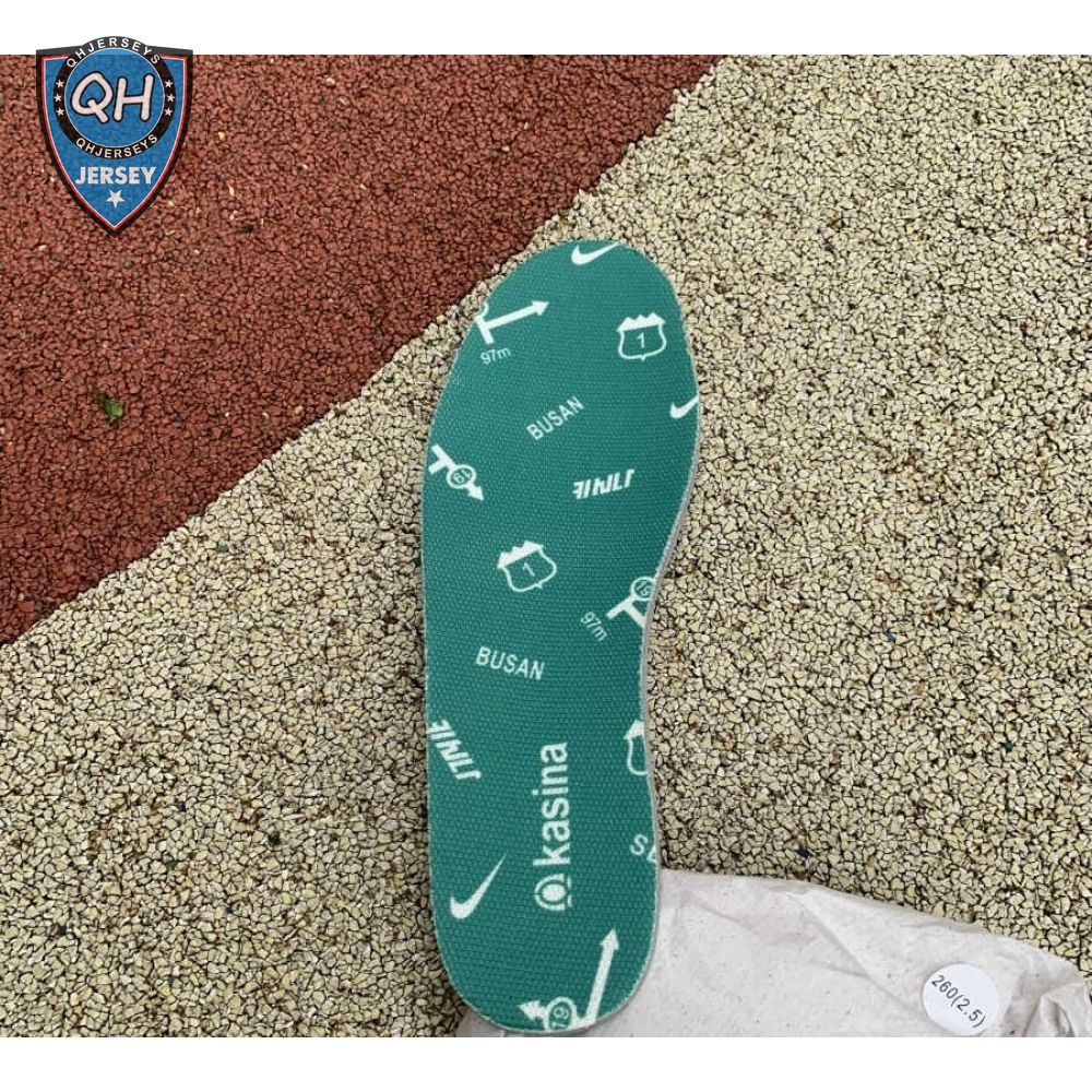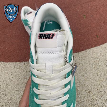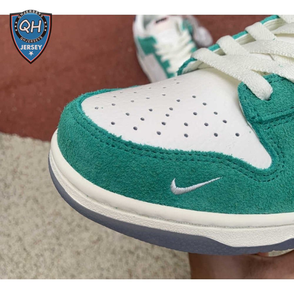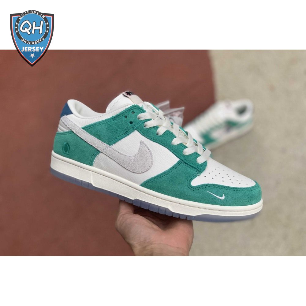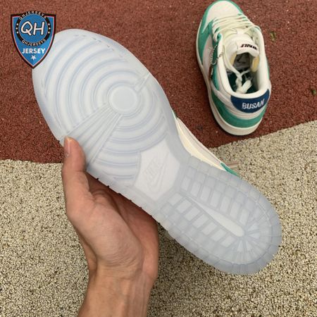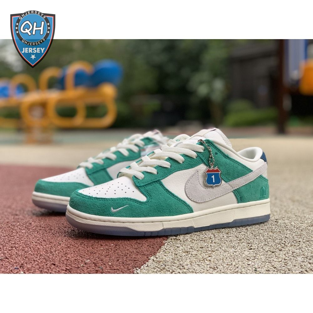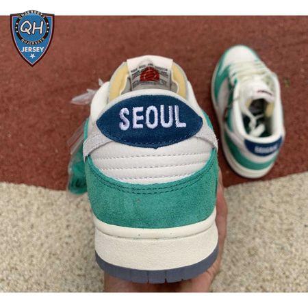 Made in collaboration with the Korean retailer, the Kasina x Nike Dunk Low "Road Sign" features colors inspired by the signage that lines the major highway connecting Busan and Seoul. The upper combines off-white leather with Neptune Green suede overlays and a grey suede Swoosh. Navy blue heel tabs replace Nike branding with "Busan" and "Seoul" on the left and right shoe. Additional details include Kasina"s logo on the lateral heel and the retailer"s name printed in Korean lettering on the tongue tag.