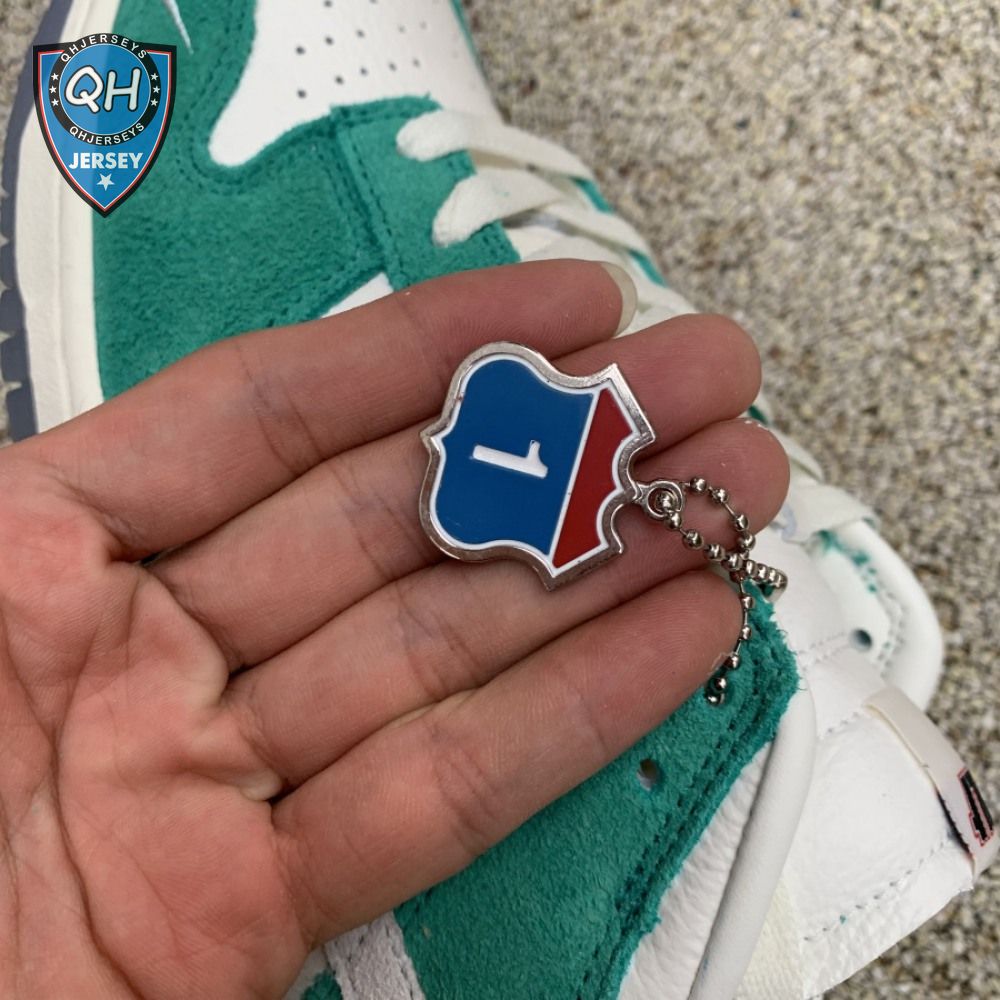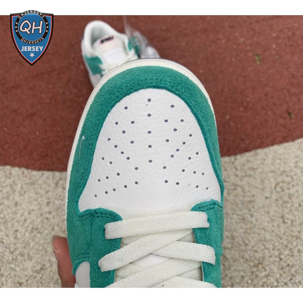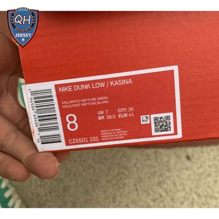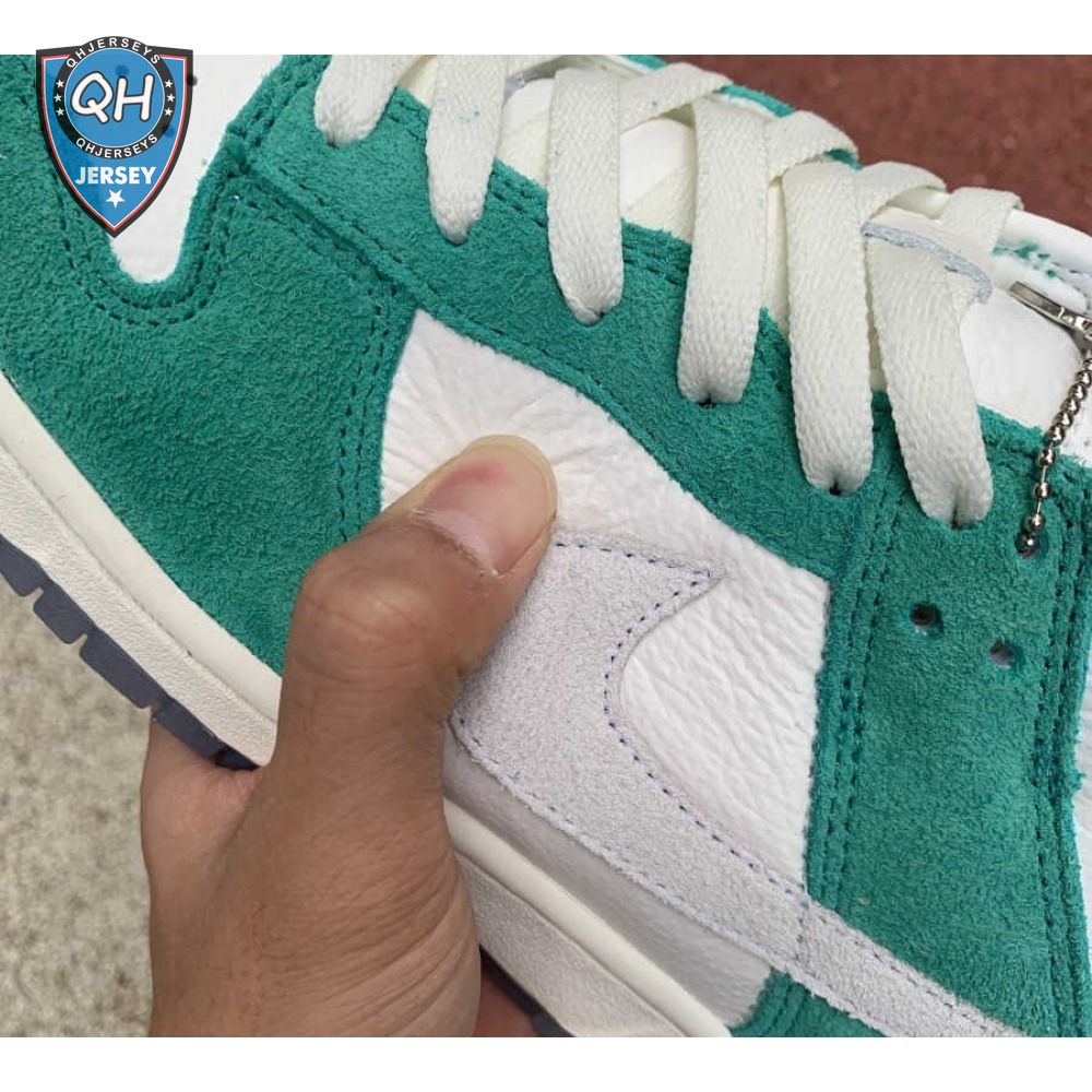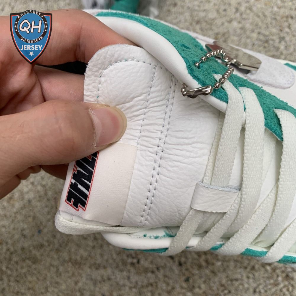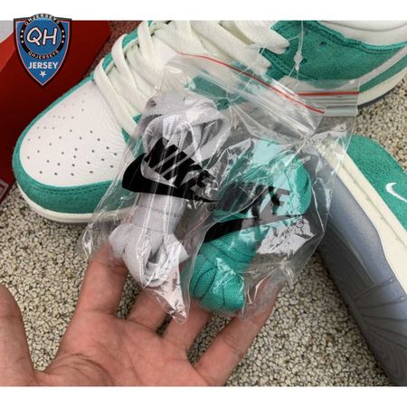 Made in collaboration with the Korean retailer, the Kasina x Nike Dunk Low "Road Sign" features colors inspired by the signage that lines the major highway connecting Busan and Seoul. The upper combines off-white leather with Neptune Green suede overlays and a grey suede Swoosh. Navy blue heel tabs replace Nike branding with "Busan" and "Seoul" on the left and right shoe. Additional details include Kasina"s logo on the lateral heel and the retailer"s name printed in Korean lettering on the tongue tag.