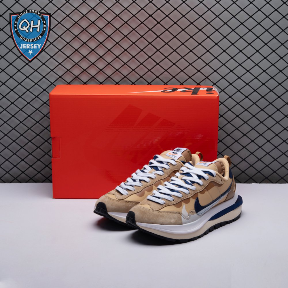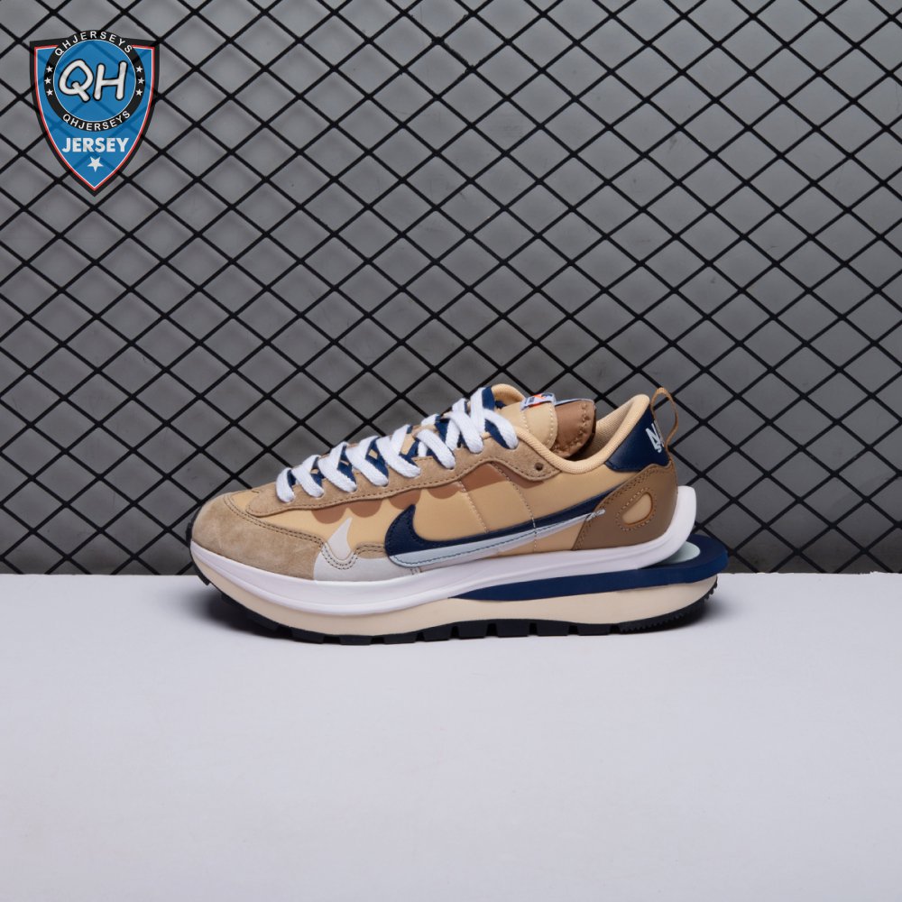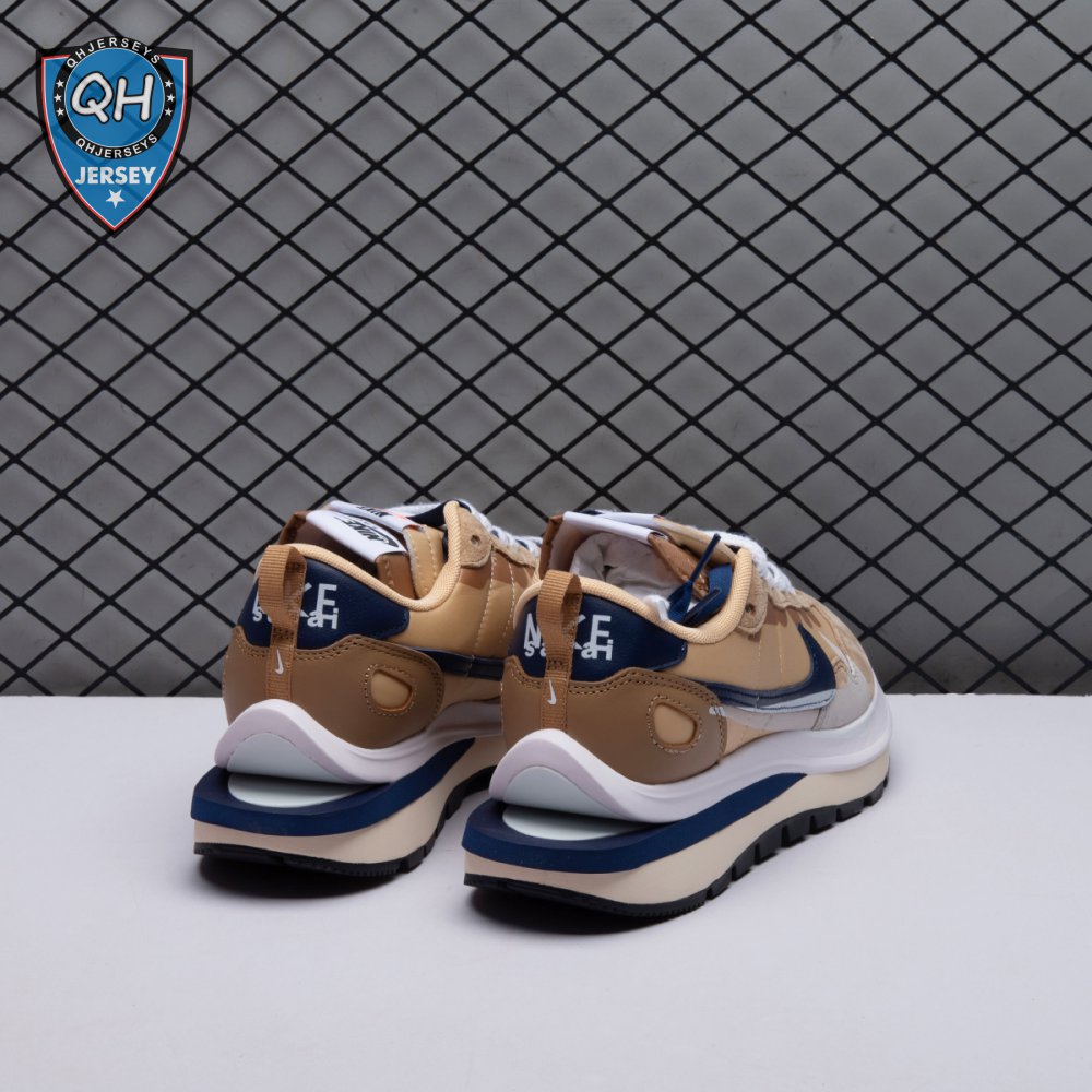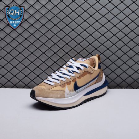 The sacai x Nike VaporWaffle "Sesame Blue Void" reunites the Swoosh with the Tokyo-based fashion label helmed by Chitose Abe. Blending elements from the modern Vaporfly and vintage Pegasus runner from 1983, the hybrid silhouette makes use of a khaki textile upper with tonal leather and suede overlays. A blue leather Swoosh is joined by a larger printed Swoosh in contrasting white. Tongues are similarly doubled up, each accented with a woven Nike tag. The sneaker rides on a dual-layered foam midsole, featuring split heel detailing and supported by a classic waffle tread outsole.