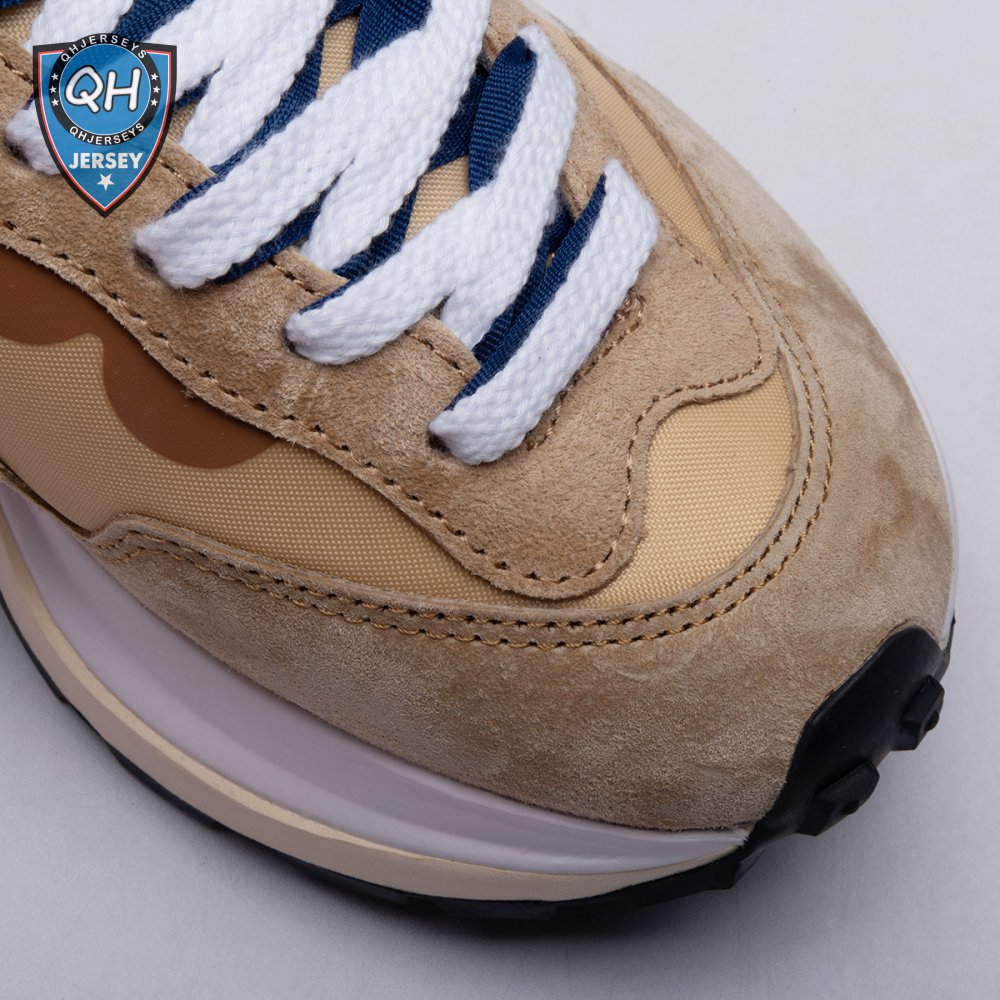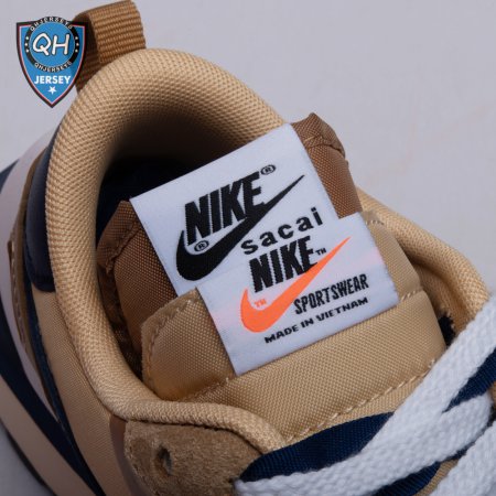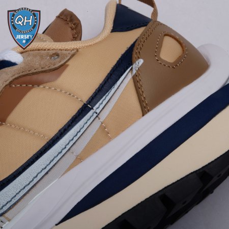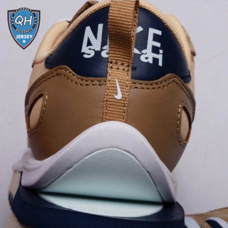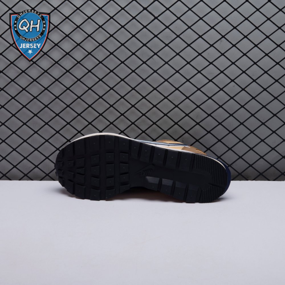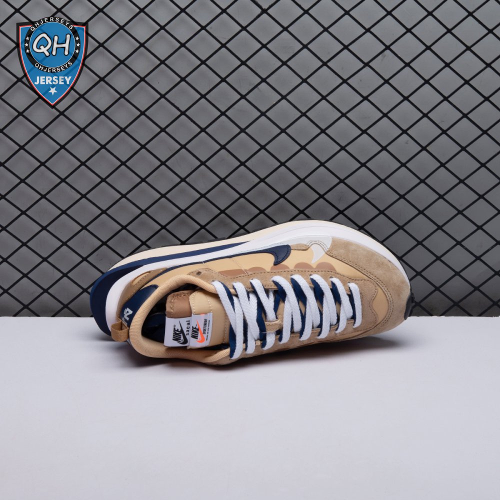 The sacai x Nike VaporWaffle "Sesame Blue Void" reunites the Swoosh with the Tokyo-based fashion label helmed by Chitose Abe. Blending elements from the modern Vaporfly and vintage Pegasus runner from 1983, the hybrid silhouette makes use of a khaki textile upper with tonal leather and suede overlays. A blue leather Swoosh is joined by a larger printed Swoosh in contrasting white. Tongues are similarly doubled up, each accented with a woven Nike tag. The sneaker rides on a dual-layered foam midsole, featuring split heel detailing and supported by a classic waffle tread outsole.